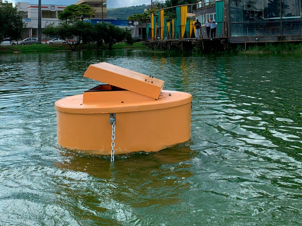 Boia circular com sistema de ultrassom para controle da proliferação de algas e cianobactérias e monitoramento de parâmetros de recursos hídricos.