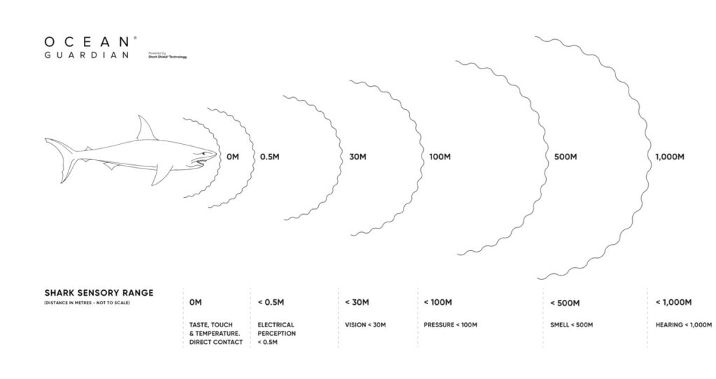 Os tubarões têm sensibilidade a correntes elétricas a partir de uma distancia de 0,5 metros e sensibilidade a som a partir de 1.000 metros.